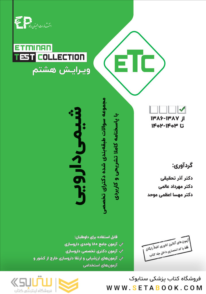 کتاب مجموعه سوالات طبقه بندی شده دکترای تخصصی شیمی دارویی، اثری ارزشمند از دکتر مهسا اعظمی موحد، به عنوان یک منبع جامع و کامل، داوطلبان آزمون دکترا در رشته شیمی دارویی را در مسیر آمادگی یاری می رساند. این کتاب با گردآوری و طبقه بندی دقیق سوالات آزمون های برگزار شده از سال 1386 تا 1403، پوششی جامع بر مباحث کلیدی این رشته ارائه می دهد.