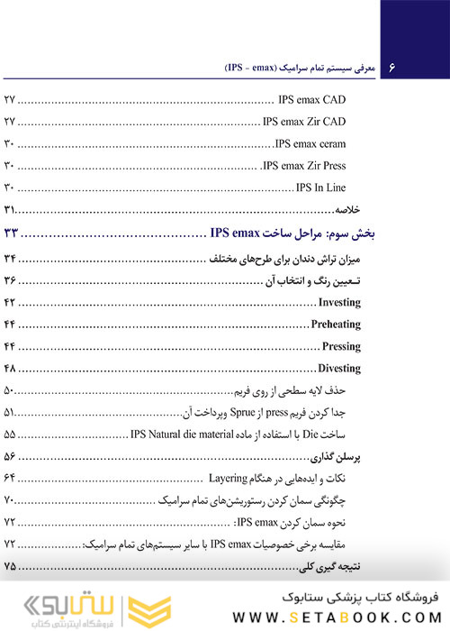 (34 ) معرفی سیستم تمام سرامیک IPS - e max معرفی سیستم تمام سرامیک IPS - e max معرفی سیستم تمام سرامیک IPS - e max معرفی سیستم تمام سرامیک IPS - e max کد کتاب: 106832 ناشر: رویان پژوه گروه بندی : مرجع مرجع رویان پژوه این کتاب در حال حاضر موجود نمی باشد ، اگر می خواهید هنگام موجود شدن کتاب مطلع شوید ، دکمه پایین را بزنید آخرین مبلغ فروش این کتاب ، 298,000 تومان بوده است