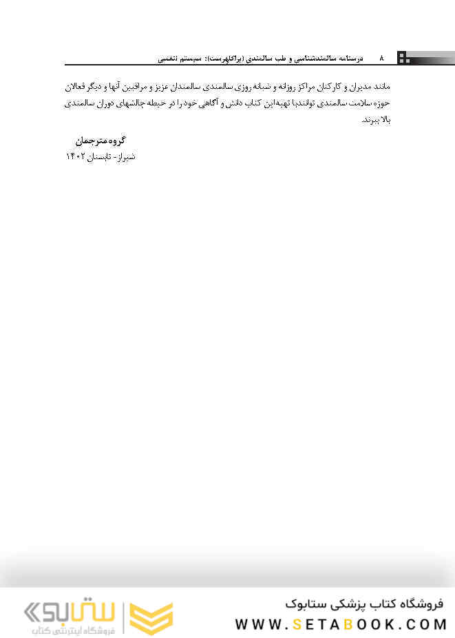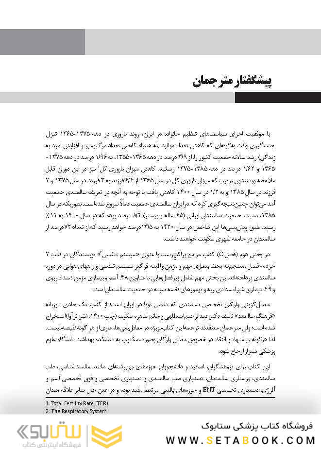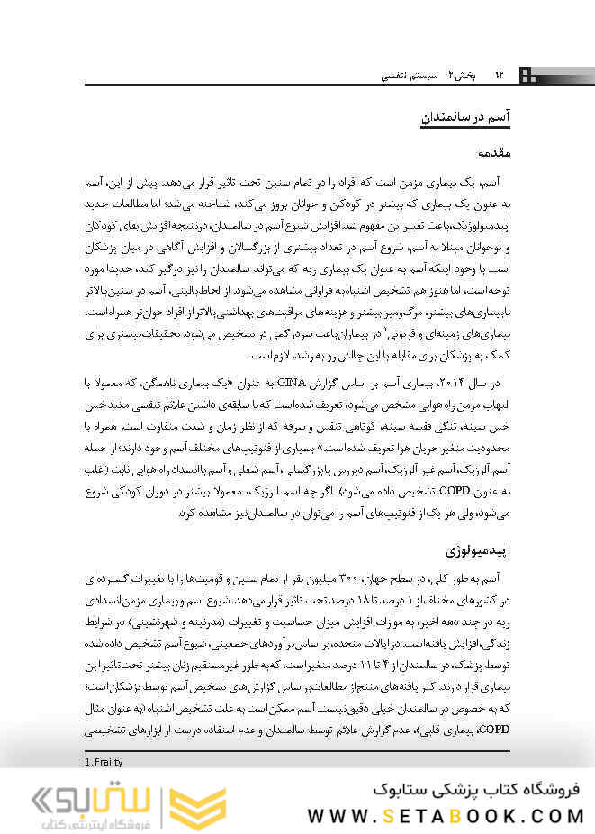 این کتاب، منبعی ضروری برای پزشکان عمومی، متخصصان داخلی، ریه، سالمندان و دانشجویان پزشکی است که به دنبال ارتقاء دانش و مهارت های خود در زمینه طب سالمندی و به ویژه اختلالات سیستم تنفسی هستند. با مطالعه این اثر، می توانید بیماران سالمند خود را با دقت و کارآمدی بیشتری یاری رسانید و به بهبود کیفیت زندگی آن ها کمک کنید.