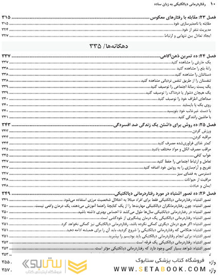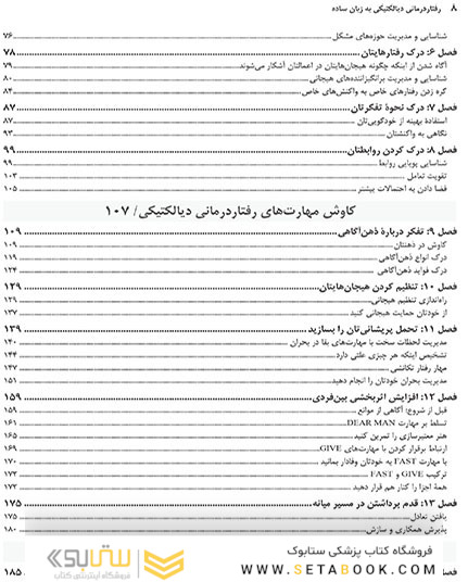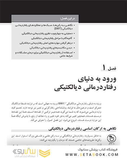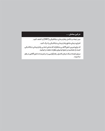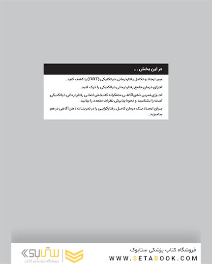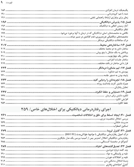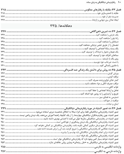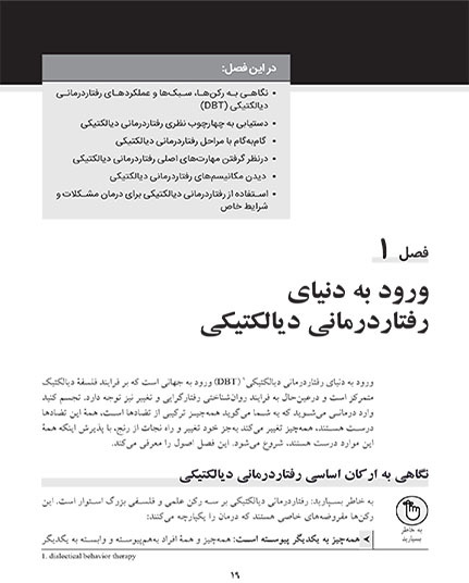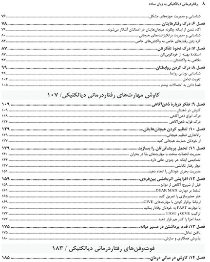- پوشش جامع مفاهیم DBT: کتاب تمامی اصول و مهارت های کلیدی DBT، از جمله ذهن آگاهی، تحمل پریشانی، تنظیم هیجانی و اثربخشی بین فردی را به تفصیل شرح می دهد.